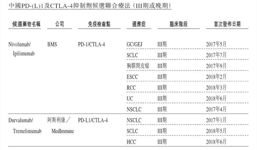 此外,兩種PD-(L)1及CTLA-4抑制劑聯(lián)合治療候選藥物的研發(fā)進(jìn)度更快,大多處于三期臨床或晚期。包括BMS的Nivolumab/Ipilimumab、阿斯利康/MedImmune的Durvalumab/Tremelimumab。