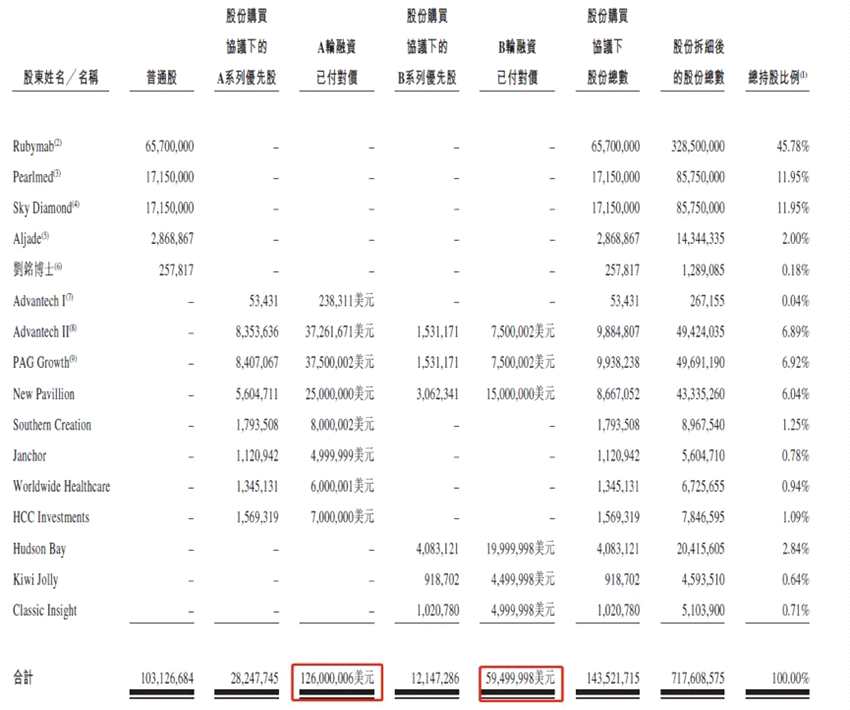 在遞交聆訊資料集之前,公司分別在2018年10月和2019年3月簽署了A輪和B輪融資的股份購買協(xié)議。信披資料顯示,兩輪融資分別募得資金約1.26億、0.59億美金。投資機(jī)構(gòu)包括尚珹資本、PAG Growth、國坤資產(chǎn)、Hudson Bay以及HCC Investments等。