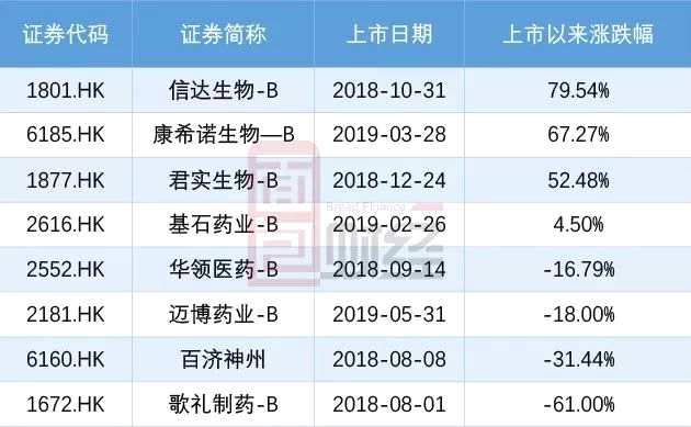 截至2019年7月22日收盤,表現(xiàn)優(yōu)秀企業(yè)如信達(dá)生物(1801.HK)、康希諾生物(6185.HK)、君實(shí)生物(1877.HK)的股價(jià)漲幅均超過了50%。與之相對(duì)應(yīng)的是,百濟(jì)神州(6160.HK)、歌禮制藥(1672.HK)的股價(jià)表現(xiàn)不佳,上市以來的跌幅在30%以上。