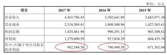 中廣核電力2018年6月19日?qǐng)?bào)送的招股書(shū)顯示,2016年、2017年歸屬于母公司股東的凈利潤(rùn)分別為74.05億元、96.25億元。