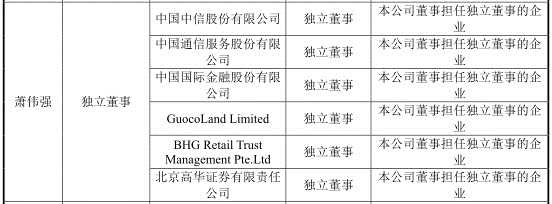 此外,蕭偉強(qiáng)還擔(dān)任中國(guó)中信股份有限公司、中國(guó)通信服務(wù)股份有限公司等在內(nèi)的多家企業(yè)獨(dú)立董事。