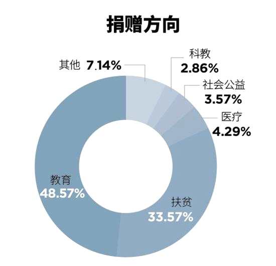 從捐贈方向來看,教育和扶貧為今年慈善捐贈的兩大主要方向。其中,教育捐贈占據(jù)了半壁江山,絕大多數(shù)的企業(yè)家非常樂于給自己的母校捐贈現(xiàn)金或設(shè)立專項教育基金。