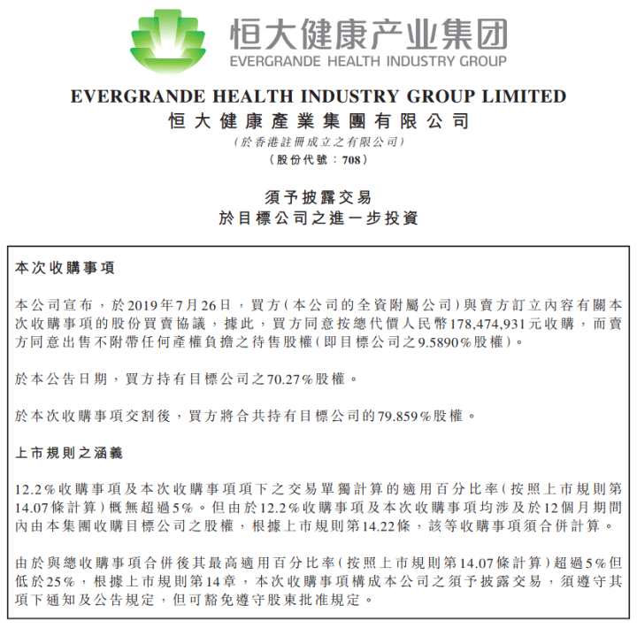 摘要: 恒大健康(00708)公布,于2019年7月26日,該公司的全資附屬公司恒大新能源科技集團有限公司作為買方與深圳市邦亞電子科技有限公司作為賣方訂立內(nèi)容有關(guān)收購事項的股份買賣協(xié)議,買方同意按總代價人民幣