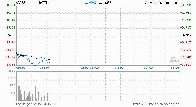 人民幣受重挫,【招商銀行(600036)、股吧】(03968)H股現價跌2.92%,報38.25元,盤中低見38.2元;成交約261萬股,涉資1.00億元。