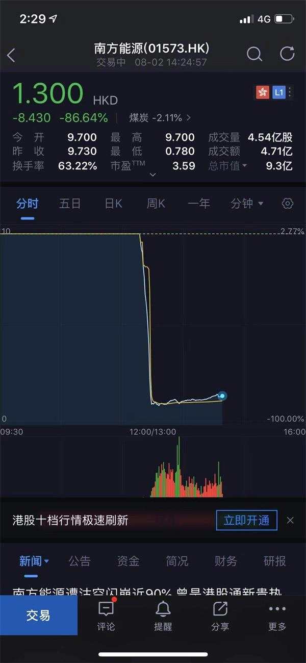 短短15分鐘內(nèi)跌幅超90%,盤中最低價(jià)到0.78港元,市值一度蒸發(fā)超60億。