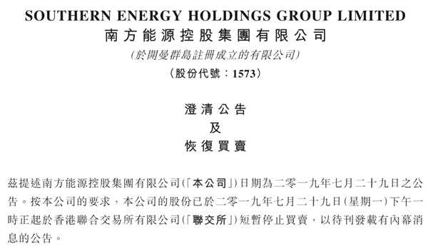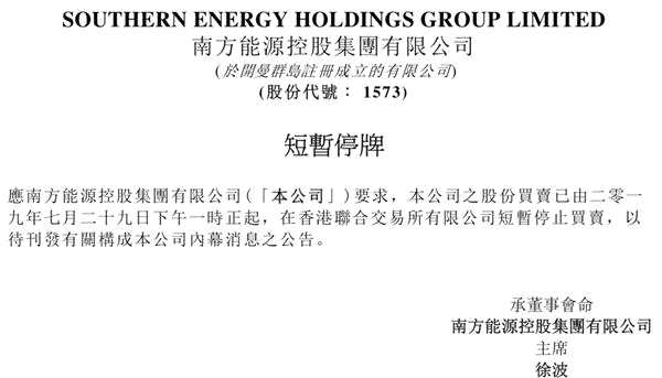 7月29日當(dāng)天下午一點(diǎn),南方能源緊急申請停牌,停牌前收跌2.21%,報(bào)9.73港元。