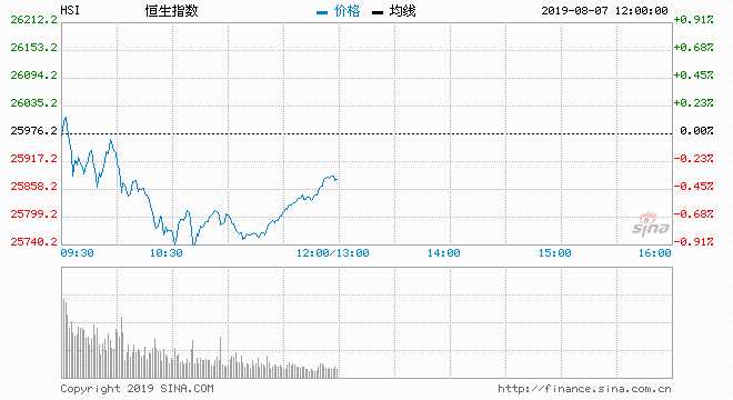 摘要: 8月7日消息,隔夜美股大幅反彈,三大股指均漲逾1%。今日早盤,恒指高開低走,一度跌超1%,此后跌幅收窄。截至午盤,恒指跌0.37%,報(bào)25879.14點(diǎn)。國企指數(shù)跌0.63%,報(bào)9949.36點(diǎn);紅籌