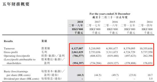觀察公司近5年業(yè)績可以發(fā)現(xiàn),公司營業(yè)額從2014年的103.5億不斷下滑,2018年只剩下41.27億的營業(yè)額;公司毛利也從2014年的57億下滑到2018年的20.61億;2015年,公司凈利從盈利轉(zhuǎn)為虧損,2018年虧損則進(jìn)一步擴(kuò)大到近10億。