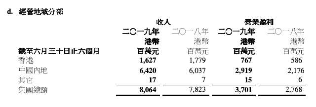 如果分區(qū)域來看,則內(nèi)地與其他區(qū)域的收入同比為增加的,香港區(qū)域貢獻的收入出現(xiàn)減少。
