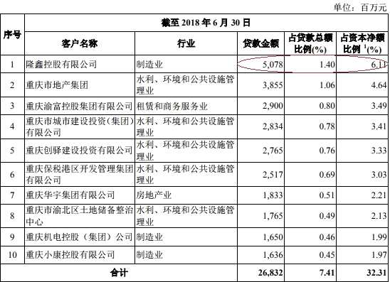 截至2018年6月末,在重慶農商行最大十家貸款客戶中,第一大貸款客戶為隆鑫控股,貸款金額為50.78億元;來自隆鑫控股的貸款利息收入為1.34億元,占比為1.45%。