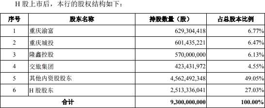 H股上市后,重慶渝富為重慶農商行第一大股東,持股數量6.29億股,占總股本比例6.77%;第二大股東重慶城投持股數量6.01億股,占總股本比例6.47%;第三大股東隆鑫控股持股數量5.70億股,占總股本比例6.13%;第四大股東交旅集團持股數量4.23億股,占總股本比例4.55%。