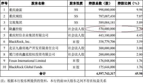 截至2018年8月末,重慶農商行前十名股東中,第四大股東隆鑫控股有限公司(以下簡稱“隆鑫控股”)持股總數為5.70億股,持股比例為5.70%。