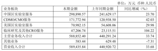 報(bào)告期內(nèi),藥明康德各板塊業(yè)務(wù)均保持強(qiáng)勁的發(fā)展勢(shì)頭。藥明康德實(shí)現(xiàn)營(yíng)業(yè)收入人民幣58.94億元,同比增長(zhǎng)33.68%。其中,中國(guó)區(qū)實(shí)驗(yàn)室服務(wù)實(shí)現(xiàn)收入人民幣29.89億元,同比增長(zhǎng)23.70%;CDMO/CMO服務(wù)實(shí)現(xiàn)收入人民幣17.18億元,同比增長(zhǎng)42.03%;美國(guó)區(qū)實(shí)驗(yàn)室服務(wù)實(shí)現(xiàn)收入人民幣7.10億元,同比增長(zhǎng)29.98%;臨床研究及其他CRO服務(wù)實(shí)現(xiàn)收入人民幣4.72億元,同比增長(zhǎng)104.22%。