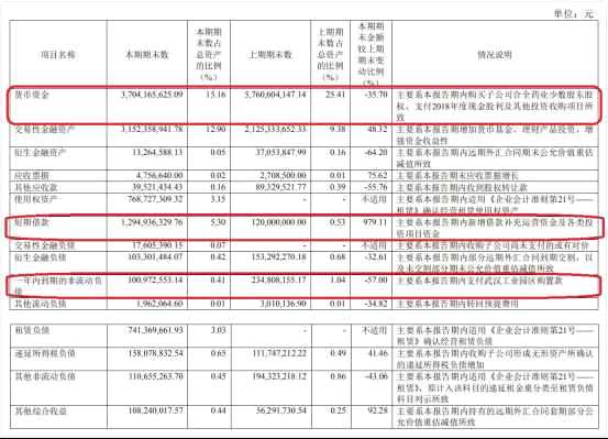 半年報(bào)顯示,截至2019年上半年末,藥明康德貨幣資金37.04億元,較上期期末減少35.7%,貨幣資金占總資產(chǎn)比例為15.16%;短期借款12.95億元,較上期期末增加979.11%,短期借款占總資產(chǎn)比例為5.3%;一年內(nèi)到期的非流動(dòng)負(fù)債1.01億元,較上期期末減少57%,占總資產(chǎn)比例為0.41%。
