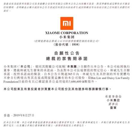8月27日,林斌在其個人微博賬號發(fā)言稱,“十年前我有幸受雷總邀請參與創(chuàng)辦小米,從創(chuàng)業(yè)第一天,我就把所有精力都投入到了小米。對于我,小米就是我事業(yè)的全部,沒有之一。這次減持只占我所有股份的1.48%,小米依然是我事業(yè)的全部。我愛小米,我對小米的未來充滿信心,我相信小米模式一定能成功。這次自愿承諾未來12個月不再減持,也是我對小米有信心的體現(xiàn)?!?/p>