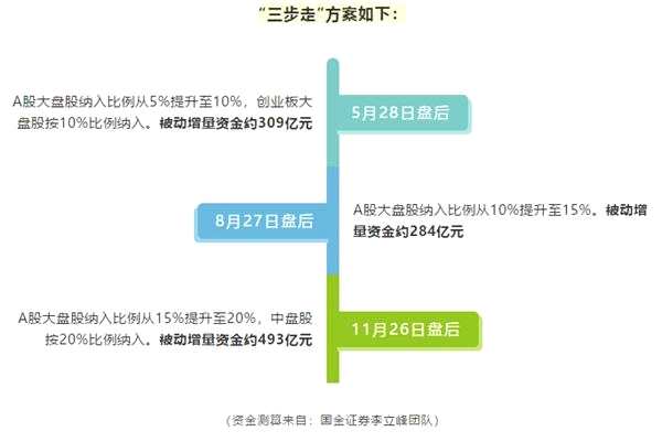 按照MSCI的時間表。作為2019年11月的半年度指數(shù)審議的一部份,MSCI會把指數(shù)中的所有中國大盤A股納入因子從15%增加至20%,同時將中國中盤A股(包括符合條件的創(chuàng)業(yè)板股票)以20%的納入因子納入MSCI指數(shù)。