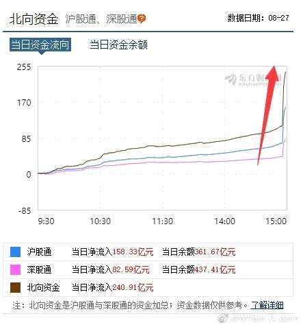 可以看看北上資金的最后,在集合競價時一分鐘左右凈流入額為110億,隨后北上資金凈流入額急速達到240億,市場一度歡呼。