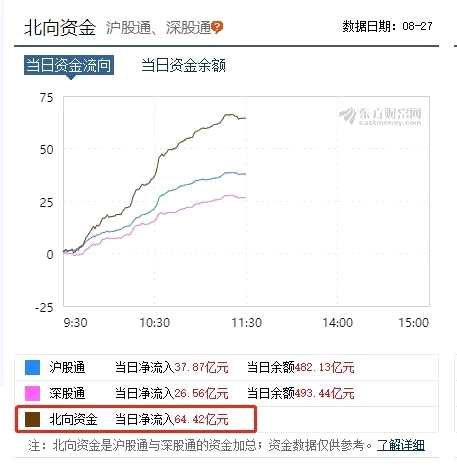 今日上午北上資金大舉買入近65億元,其中滬股通凈買入37.87億元,深股通凈買入26.56億元。