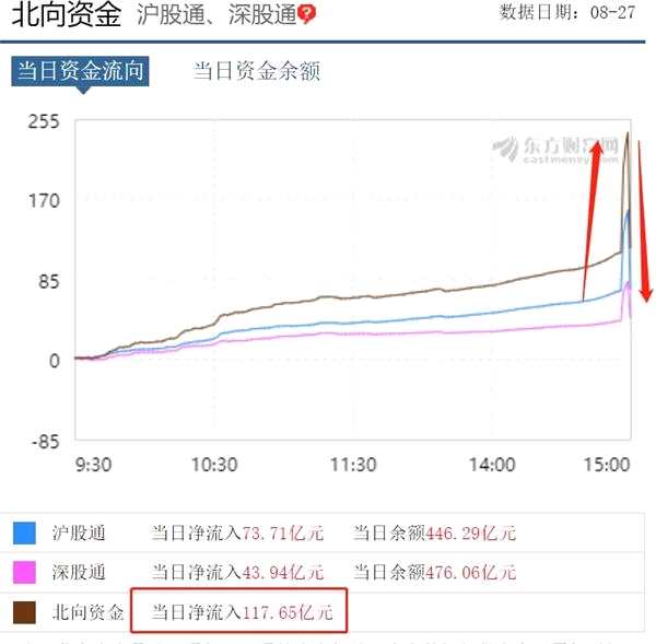 但隨后卻潑下一盆冷水:收盤數(shù)據(jù)顯示,北上資金最終凈流入額為117億,這意味著,在尾盤有120多億資金進行了賣出。