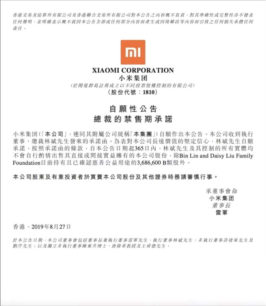 今日早間,小米集團(tuán)發(fā)布公告稱(chēng),收到公司總裁、執(zhí)行董事林斌的承諾函,承諾為表達(dá)對(duì)小米集團(tuán)長(zhǎng)遠(yuǎn)價(jià)值的堅(jiān)定信心 ,林斌自本公告日期起 365 日內(nèi) ,其本人及其控制的所有實(shí)體,均不會(huì)自行出售其直接或間接擁有的小米集團(tuán)股份 ,慈善基金B(yǎng)in Lin and Daisy Liu Family Foundation目前持有且已確認(rèn)慈善公益用途的368.66萬(wàn)B類(lèi)股除外。