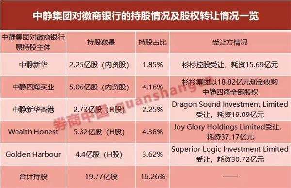 而除內(nèi)資股外,中靜新華還通過旗下三個100%控制的境外企業(yè)合計持有12.46億股徽商銀行H股。