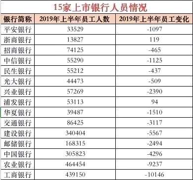 從15家銀行的員工人數(shù)變動(dòng)情況來(lái)看,無(wú)論國(guó)有行還是股份行上半年均出現(xiàn)減員情況。