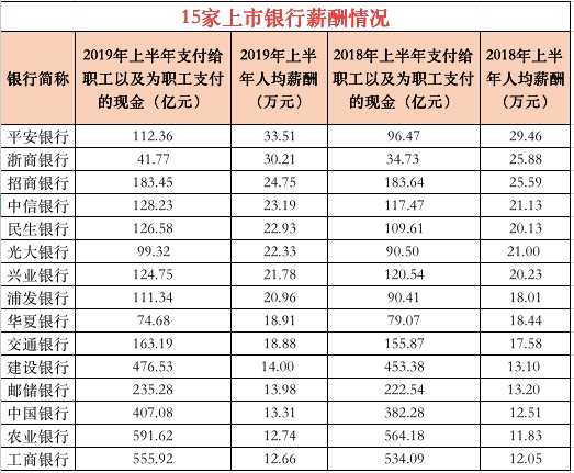 摘要: 上市銀行終于完成中報(bào)披露,上半年銀行業(yè)人均薪酬的情況也浮出水面。通過(guò)統(tǒng)計(jì)在AH股上市的15家國(guó)有銀行和全國(guó)性股份制銀行的情況,基金君發(fā)現(xiàn),今年上半年,平安銀行繼續(xù)蟬聯(lián)人均薪酬最高,按照實(shí)際發(fā)放的工資,
