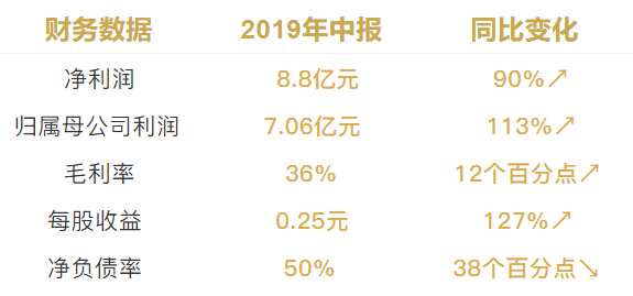 根據(jù)2019年上半年的數(shù)據(jù),公司凈負債率為50%,較去年年末下降38%;凈利潤為8.8億人民幣,同比增長90%;毛利率由2018年同期的的24%上升為36%。