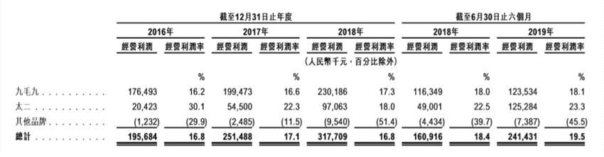招股書顯示,2016年、2017年、2018年和2019年上半年,九毛九集團(tuán)的營業(yè)收入分別為人民幣11.64億、14.69億、18.93億和12.37億元,相應(yīng)的凈利潤分別為人民幣0.51億、0.72億、0.73億和1.02億元。 2019年上半年與2018年同期相比,凈利潤增長率為87.6%。 看上去凈利潤增長強(qiáng)勁,但從具體經(jīng)營中難見上漲勢頭。根據(jù)招股書披露,九毛九和太二兩項(xiàng)是集團(tuán)總收入的絕對大頭。2016年、2017年、2018年和2019年上半年,九毛九品牌的經(jīng)營利潤率分別為16.2%、16.6%、17.3%以及18.1%,太二品牌的經(jīng)營利潤率則分別為30.1%、22.3%、18%、23.3%。