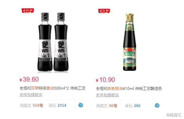 榮譽(yù)多寡的確可以視為產(chǎn)品質(zhì)量?jī)?yōu)秀與否的一個(gè)比較重要的參考標(biāo)準(zhǔn),但能否獲得消費(fèi)者青睞,相對(duì)而言更具說服力。天貓超市的料酒分類中,以銷量從多到少對(duì)產(chǎn)品進(jìn)行排名,月成交排名前十的料酒品牌中老恒和獨(dú)占兩席。其中,老恒和500ml蔥姜料酒料酒家用去腥提鮮家庭裝廚房調(diào)味料售價(jià)8元/瓶,月成交1.1萬筆;老恒和料酒家用500ml陳年釀造家庭裝料酒廚房調(diào)味料黃酒售價(jià)12.8元/瓶,月成交5114筆。