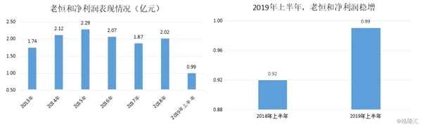 不過目前為止,老恒和產(chǎn)品質(zhì)量與品牌知名度尚未給公司帶來穩(wěn)定的利潤(rùn)增長(zhǎng)。2016-2017年,老恒和凈利潤(rùn)“兩連降”,直到2018年凈利潤(rùn)才再度恢復(fù)升勢(shì)。2019年上半年,老恒和實(shí)現(xiàn)凈利潤(rùn)0.99億元,同比增長(zhǎng)7.7%,利潤(rùn)增速重回正軌。