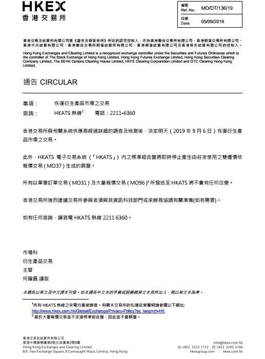 香港交易所與相關(guān)系統(tǒng)供應商經(jīng)過詳細的調(diào)查及檢測后,決定明天(2019年9月6日) 恢復衍生產(chǎn)品市場之交易。
