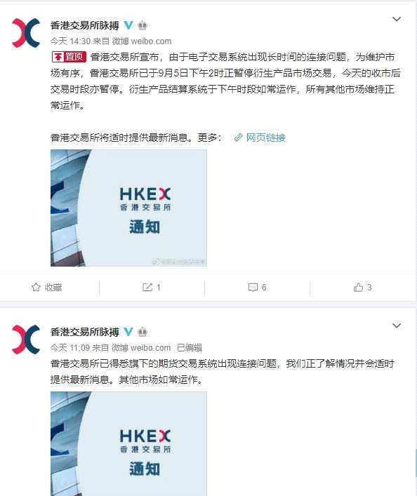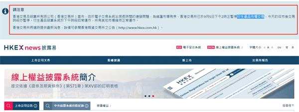 到了下午兩點,港交所宣布,由于電子交易系統(tǒng)出現(xiàn)長時間的連接問題,為維護市場有序,香港交易所已于9月5日下午2時正暫停衍生產(chǎn)品市場交易,今天的收市后交易時段亦暫停。衍生產(chǎn)品結(jié)算系統(tǒng)于下午時段如常運作,所有其他市場維持正常運作。