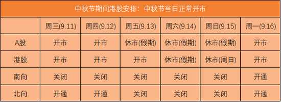 中秋節(jié)期間北向交易日安排為:9月13日(星期五)起關閉,9月16日(星期一)起照常開通港股通服務。