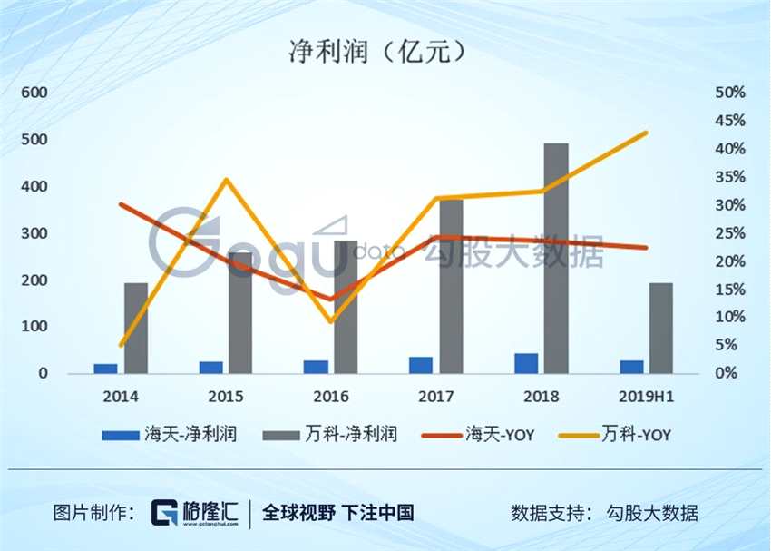 2018年,海天實現(xiàn)營收170億,凈利潤44億。同期,萬科實現(xiàn)營收2977億,凈利潤493億。