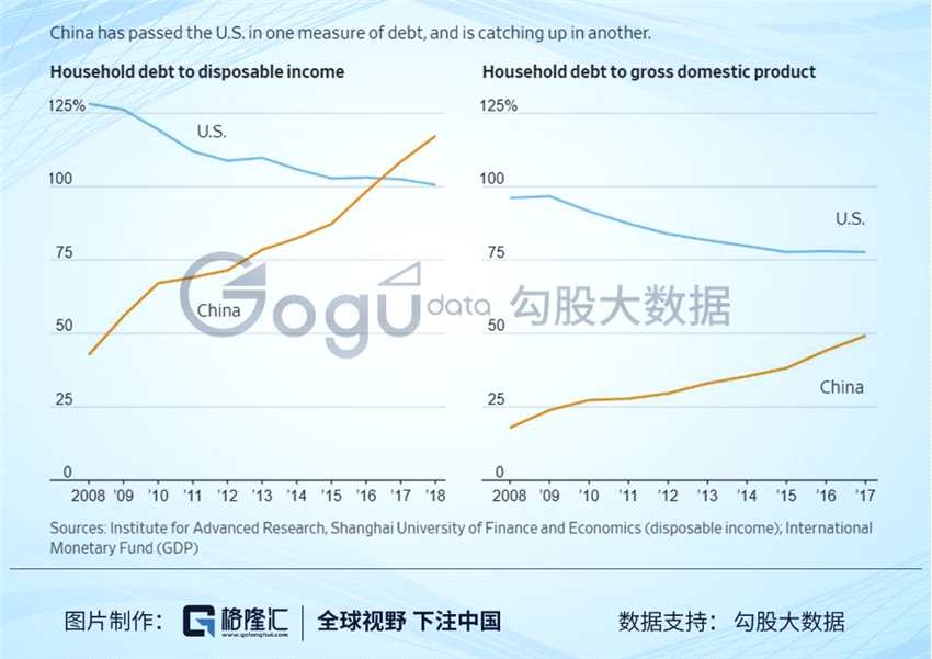 但我們知道,在GDP這塊蛋糕的分配上,中國家庭拿走的比例沒有美國家庭高,而可支配收入對個人才更有意義。所以我們換個維度,看家庭負債與可支配收入的比重,中國現(xiàn)在已經(jīng)到了120%左右,美國降到了100%左右,2008年危機前夕是125%。