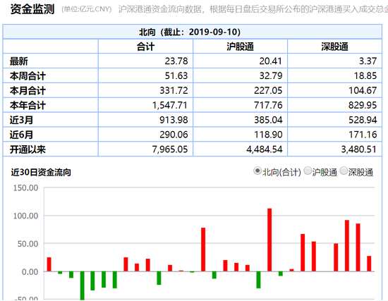 摘要: 9月10日消息,截至滬深股市收盤,北向資金合計(jì)凈流入23.78億,連續(xù)第9個交易日凈流入。具體資金流如下:滬港通資金流向方面,滬股通凈流入20.41億,港股通(滬)凈流入暫為3.14億。深港通資金流向