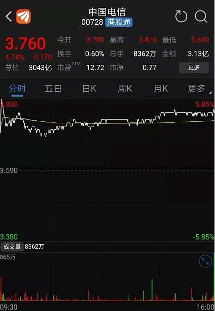 中國(guó)電信H股早盤高開(kāi)3%,截至收盤中國(guó)電信H股報(bào)3.76港元,漲幅4.74%。