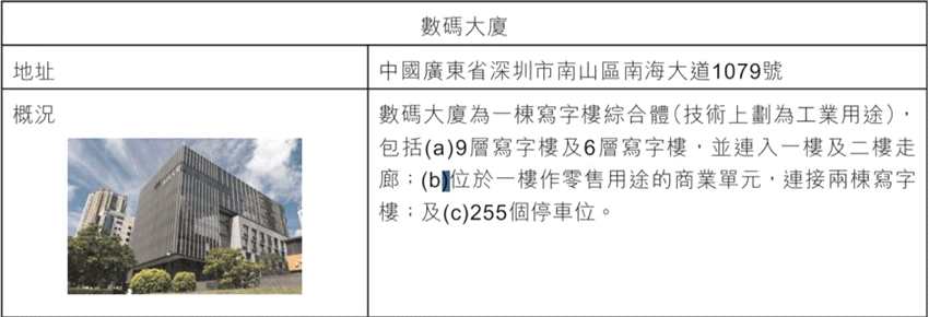 數(shù)碼大廈為一棟寫字樓綜合體,包括15層寫字樓、一層商業(yè)單元及255個(gè)停車位??勺赓U總面積為4.04萬平方米,租戶數(shù)量為32名。當(dāng)前租用率為79.9%,每平米平均月租為105.4元,物業(yè)評(píng)估價(jià)值為10.38億元。