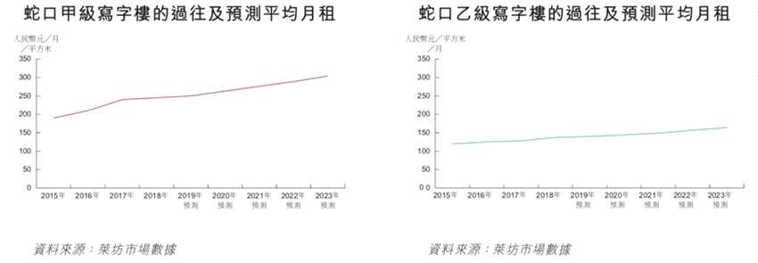 2015-2018年,蛇口甲級(jí)和乙級(jí)寫字樓的平均月租呈穩(wěn)步增長(zhǎng)態(tài)勢(shì)。根據(jù)萊坊市場(chǎng)數(shù)據(jù)預(yù)測(cè),受益于深圳整體經(jīng)濟(jì)增長(zhǎng),預(yù)期2018-2023年間蛇口甲級(jí)及乙級(jí)寫字樓的平均月租年復(fù)合增長(zhǎng)率分別為7%及3.9%。
