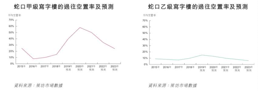 根據(jù)萊坊市場(chǎng)數(shù)據(jù)預(yù)測(cè),蛇口甲級(jí)寫字樓空置率將于2020年升至58%的峰值,原因與新建寫字樓項(xiàng)目的完工有關(guān),但預(yù)期在2023年將重新降至約24%的適當(dāng)水平。蛇口乙級(jí)寫字樓的空置率波動(dòng)較小,預(yù)計(jì)2019年將達(dá)到15%的空置率峰值,但2020年至2023年將重新回到7%至10%的較低水平區(qū)間。