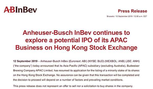 百威英博7月13日的聲明稱,已決定不再推進亞太子公司在中國香港的IPO計劃。
