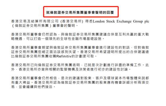 香港交易所董事會期望與倫敦證券交易所集團董事會進行建設(shè)性的對話,但對倫敦證券交易所集團拒絕正面洽談感到失望。香港交易所希望證明所提出的合并建議遠比倫敦證券交易所集團收購Refinitiv的計劃更可取。