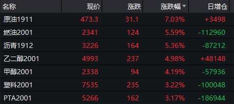 數(shù)據(jù)顯示,9月16日早間,國(guó)內(nèi)原油、燃料油、瀝青期貨主力合約均漲停開(kāi)盤(pán)。其中,原油期貨主力合約漲停價(jià)477.5元/桶,創(chuàng)下5月24日以來(lái)新高,此后漲停板打開(kāi),漲幅收窄。截至收盤(pán),原油期貨報(bào)473.3元/桶,漲幅7.03%;燃油期貨和瀝青期貨主力合約分別上漲5.59%和5.36%。