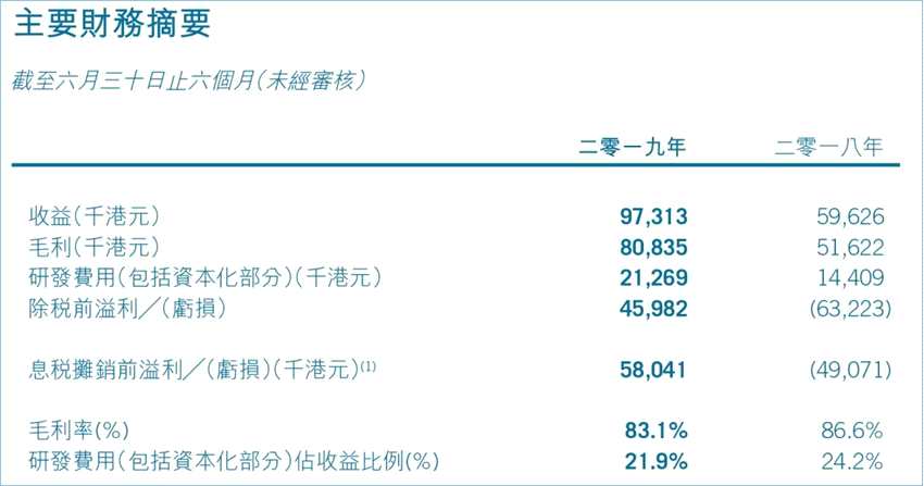 主要產(chǎn)品狀況不錯,聯(lián)康生物的業(yè)績自然是差不了。 收入,從5962.6萬港元同比上升63.2%至9731.3萬港元;稅前利潤,從虧損6322.3萬港元到盈利4598.2萬港元;研發(fā)投入仍保持21.9%的高比例。
