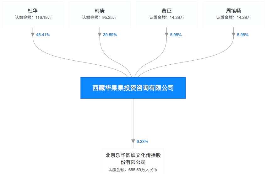 目前三位明星所在的西藏華果果投資咨詢有限公司,仍為樂華娛樂第四大股東,和杜華(樂華文化法定代表人)共同持股6.23%。