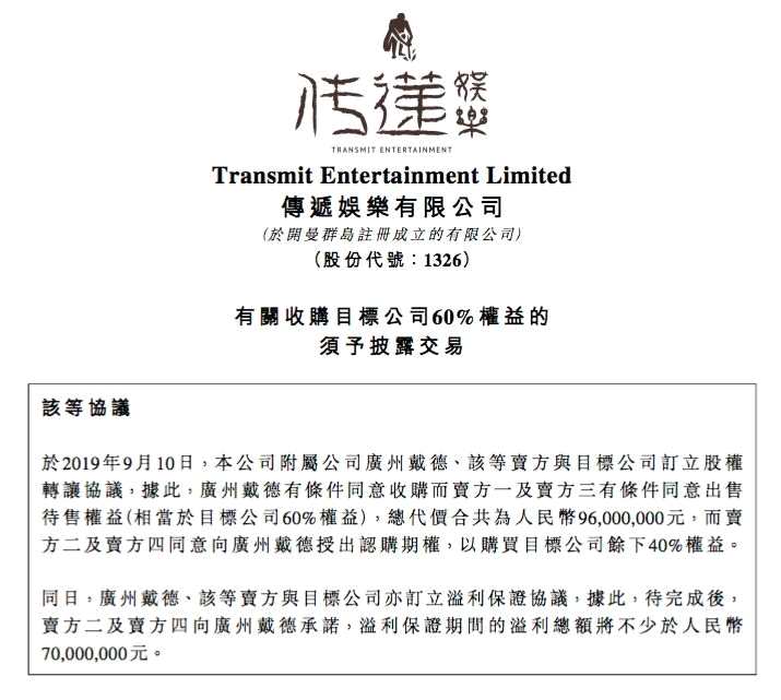 根據(jù)公告,傳遞娛樂附屬公司廣州戴德與聞瀾及其原股東簽署了股權(quán)轉(zhuǎn)讓協(xié)議,約定廣州戴德收購(gòu)聞瀾60%股權(quán),并根據(jù)聞瀾業(yè)績(jī)對(duì)賭的完成情況,在3年后有權(quán)以相應(yīng)的價(jià)格收購(gòu)剩余40%的股權(quán)。