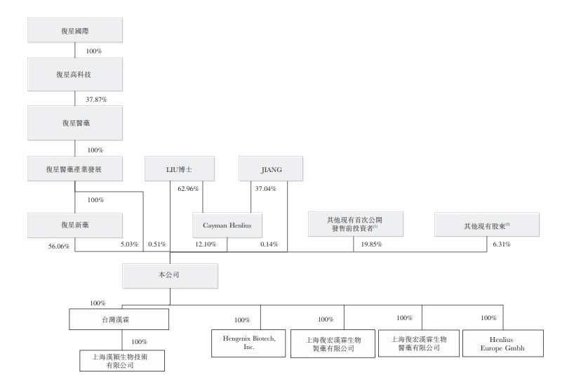 香港上市前,復(fù)星國際持有復(fù)宏漢霖61.09%股權(quán),為控股股東;劉世高和姜偉東合計(jì)持股12.75%。