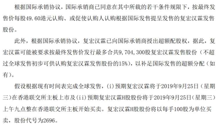 9月18日,復(fù)星醫(yī)藥(02196.HK)公告稱,其分拆上市的復(fù)宏漢霖已完成招股,其全球發(fā)售定價(jià)為每股49.6港元,預(yù)計(jì)將于9月25日在香港主板上市。以發(fā)售定價(jià)計(jì)算,復(fù)宏漢霖發(fā)行市值約267.41億港元。
