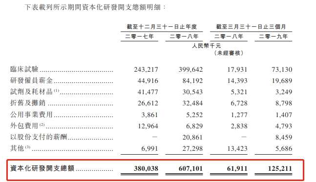 復(fù)宏漢霖在今年二季度之前尚無任何藥品上市銷售,所以仍在投入階段。2017年至2019年一季度,復(fù)宏漢霖分別虧損2.71億、4.94億和1.58億。作為一家創(chuàng)新藥研發(fā)公司,復(fù)宏漢霖的主要支出即研發(fā)投入:2017年至2019年一季度,其研發(fā)開支分別為2.57億、3.65億和1億元,整體研發(fā)開支則為6.37億、9.7億和2.25億。